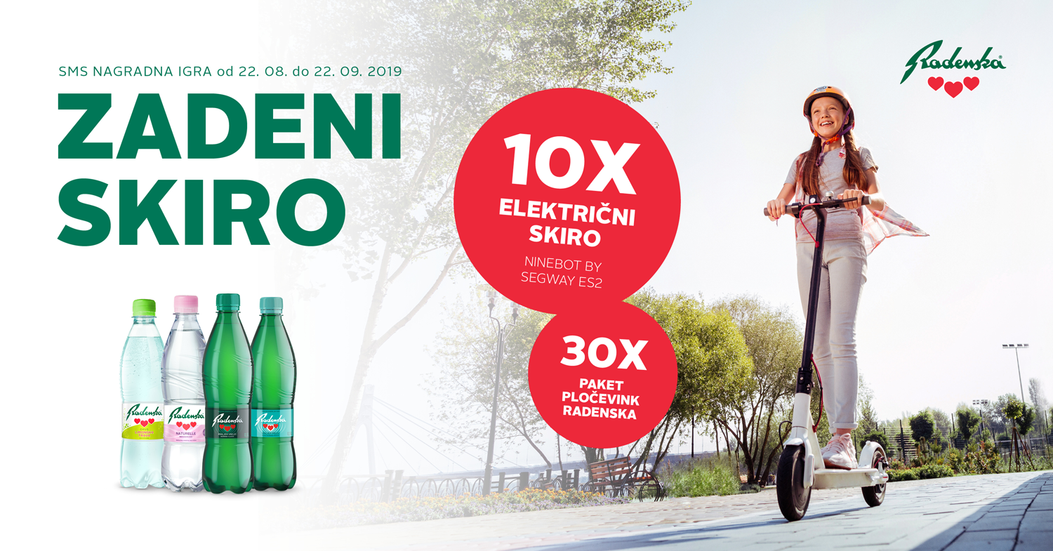 SMS nagradna igra Zadeni skiro 2019-08-20 Radenska d.o.o.V prodajalnah Mercator kupi vsaj en izdelek Radenske (Classic; Medium, Naturelle, z okusom) pošlji SMS s ključno besedo RADENSKA in kodo na računu na 3131 in sodeluj v žrebu za lepe nagrade.
